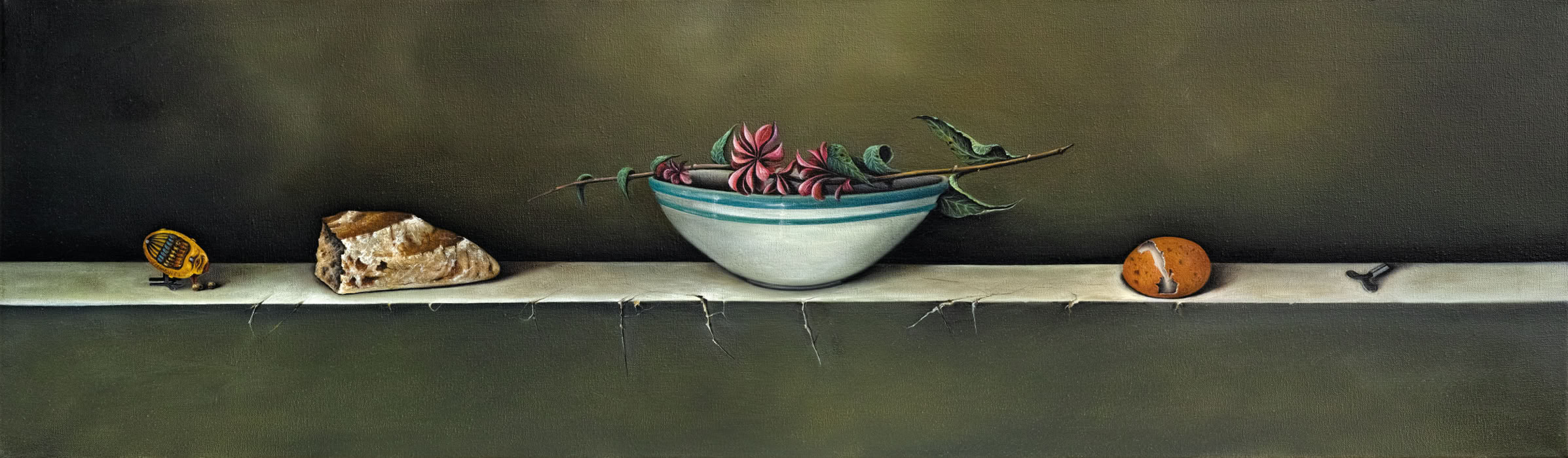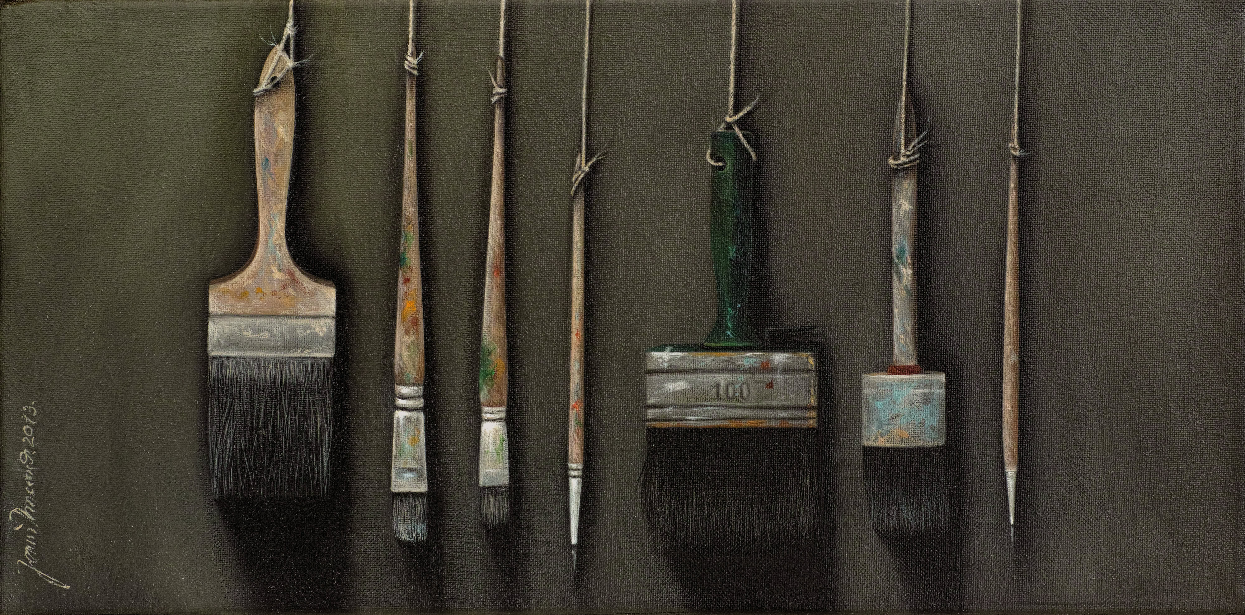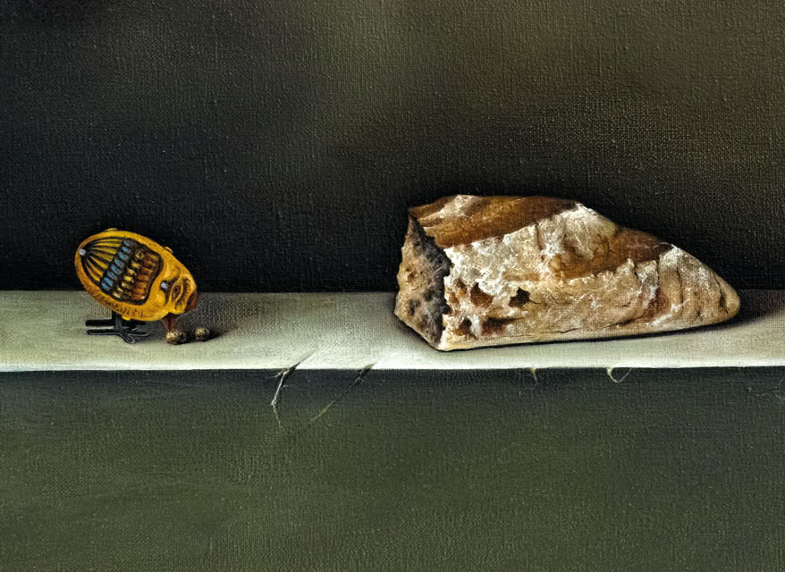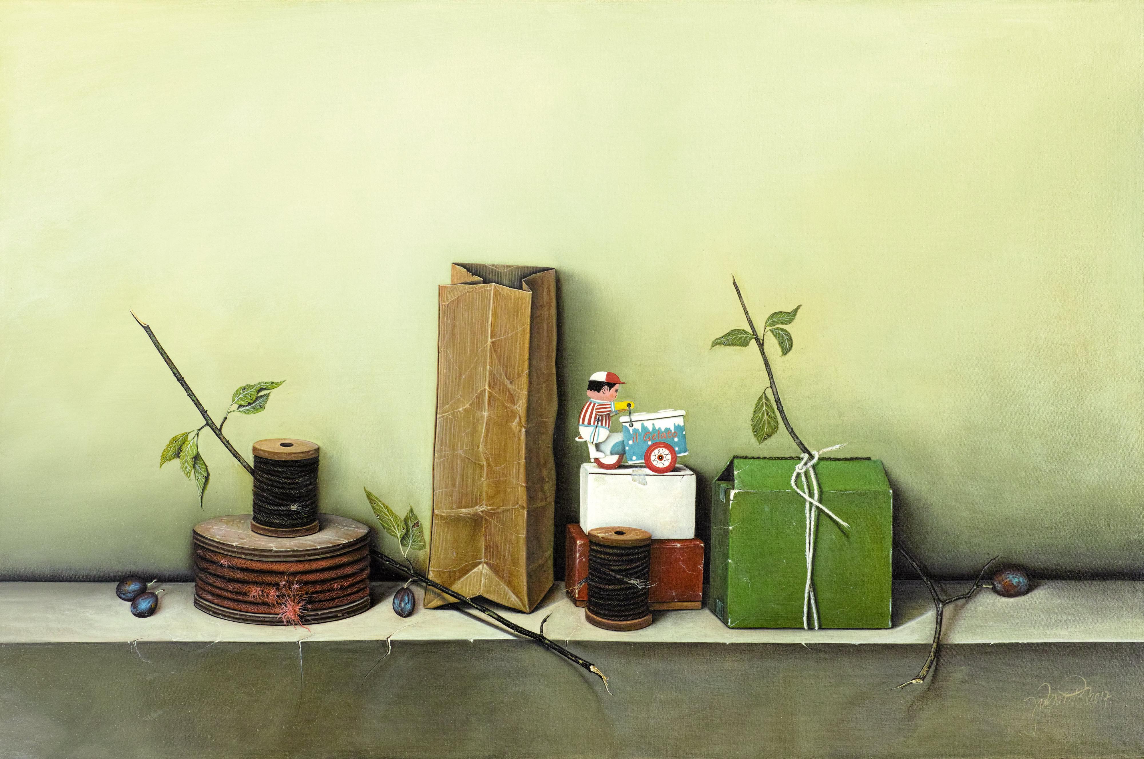 Entre hiperrealisme en la manera de pintar i un „accent surrealista“ de la composició, em plantejo escenaris on els objectes triats ocupen el seu lloc. La il·luminació, punt molt important en la composició, el clarobscur engloba els objectes i la llum els individualitza i aïlla.