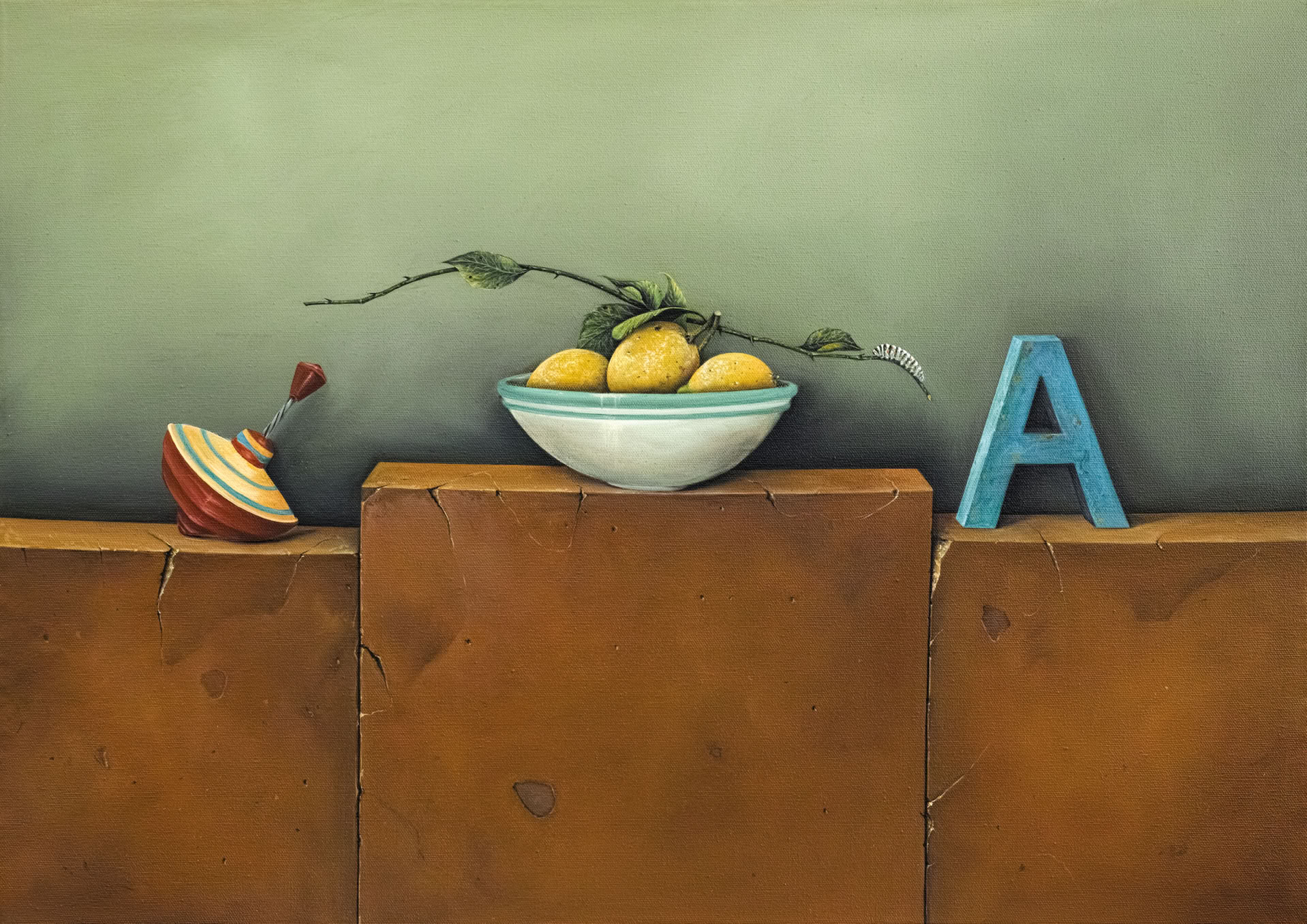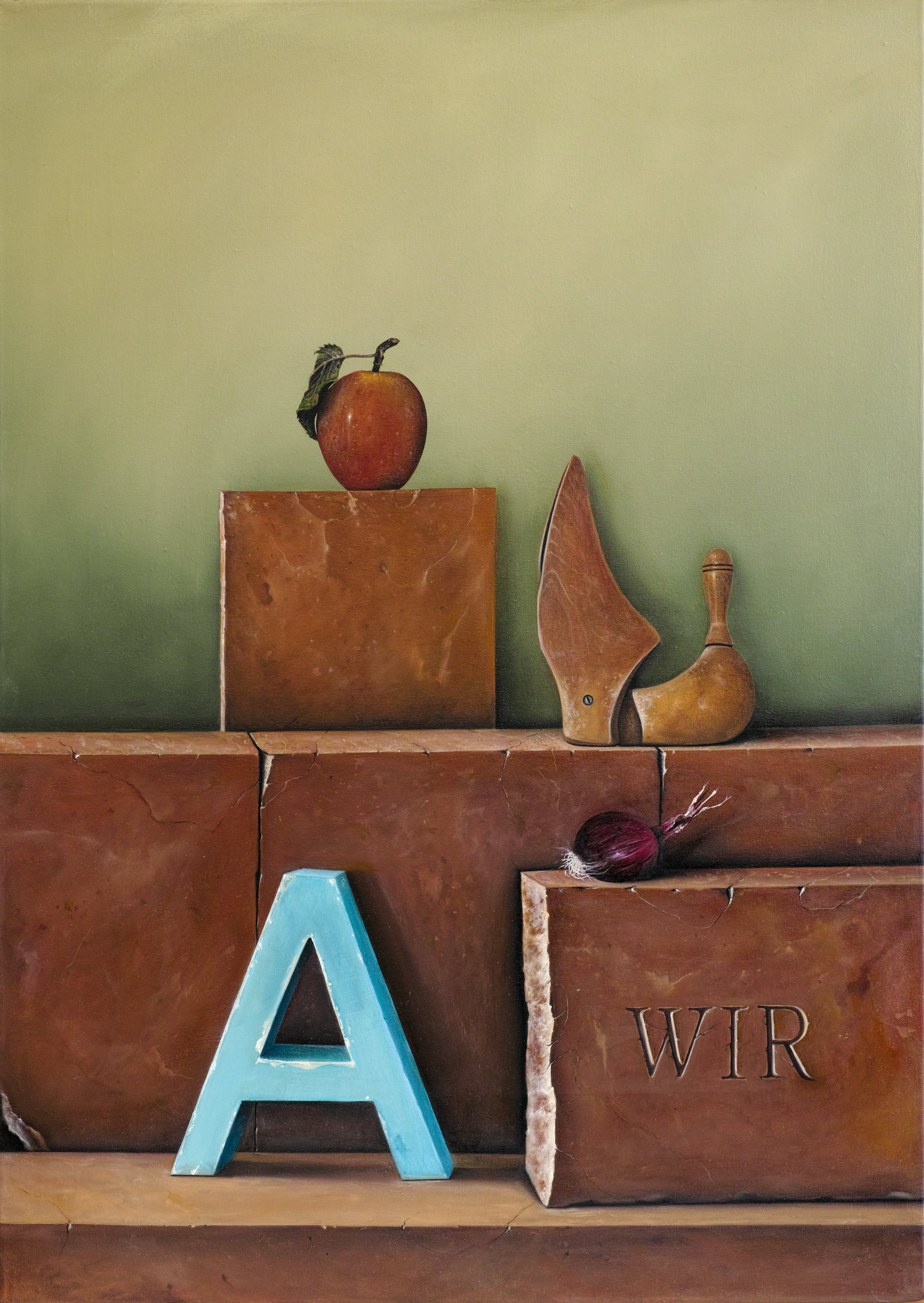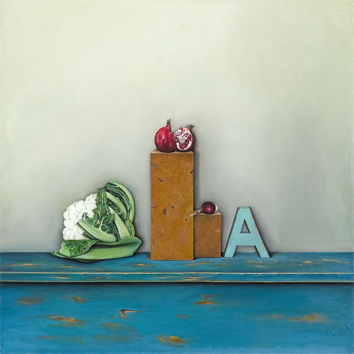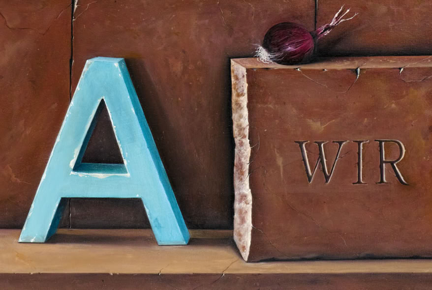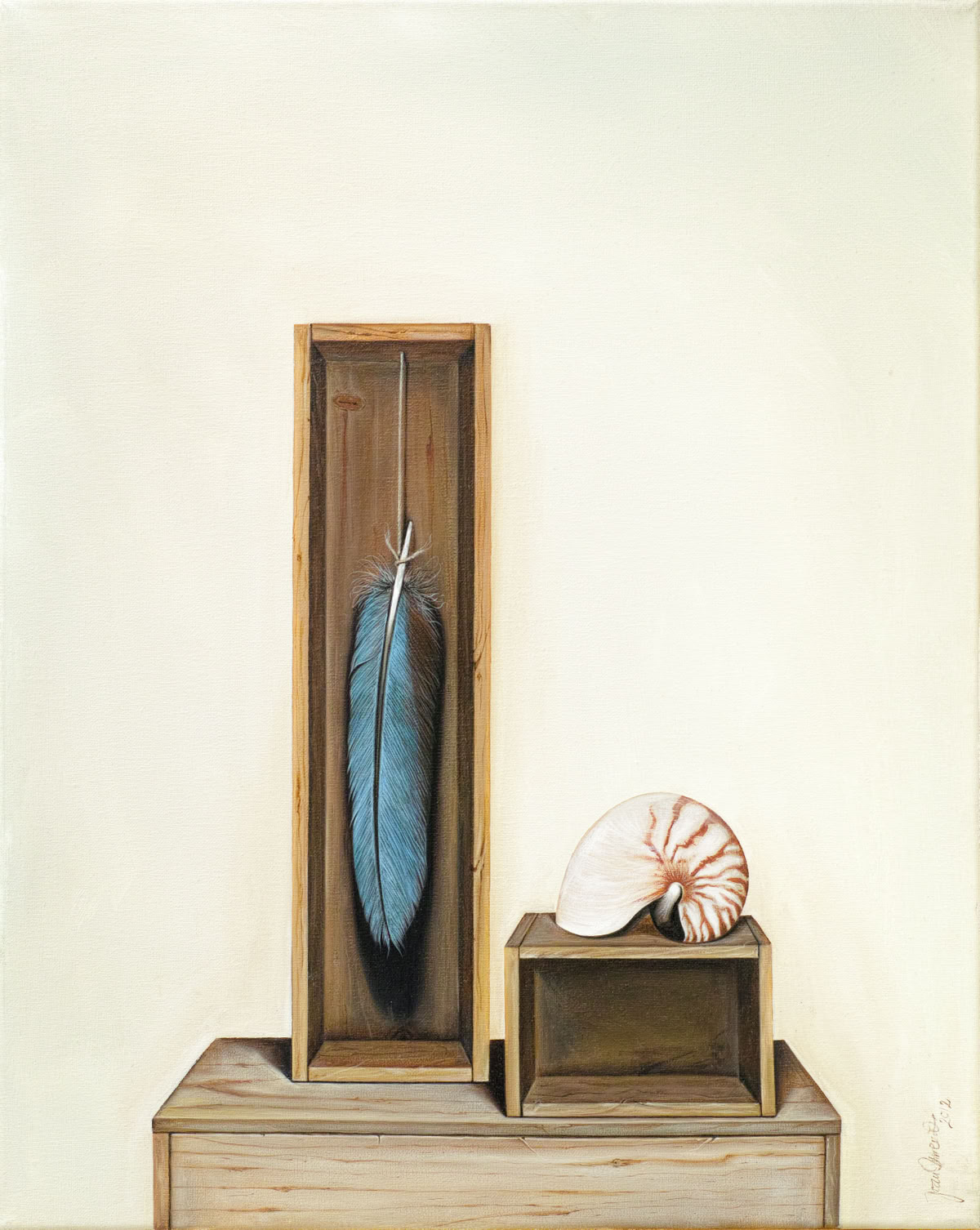 Entre hiperrealisme en la manera de pintar i un „accent surrealista“ de la composició, em plantejo escenaris on els objectes triats ocupen el seu lloc. La il·luminació, punt molt important en la composició, el clarobscur engloba els objectes i la llum els individualitza i aïlla.