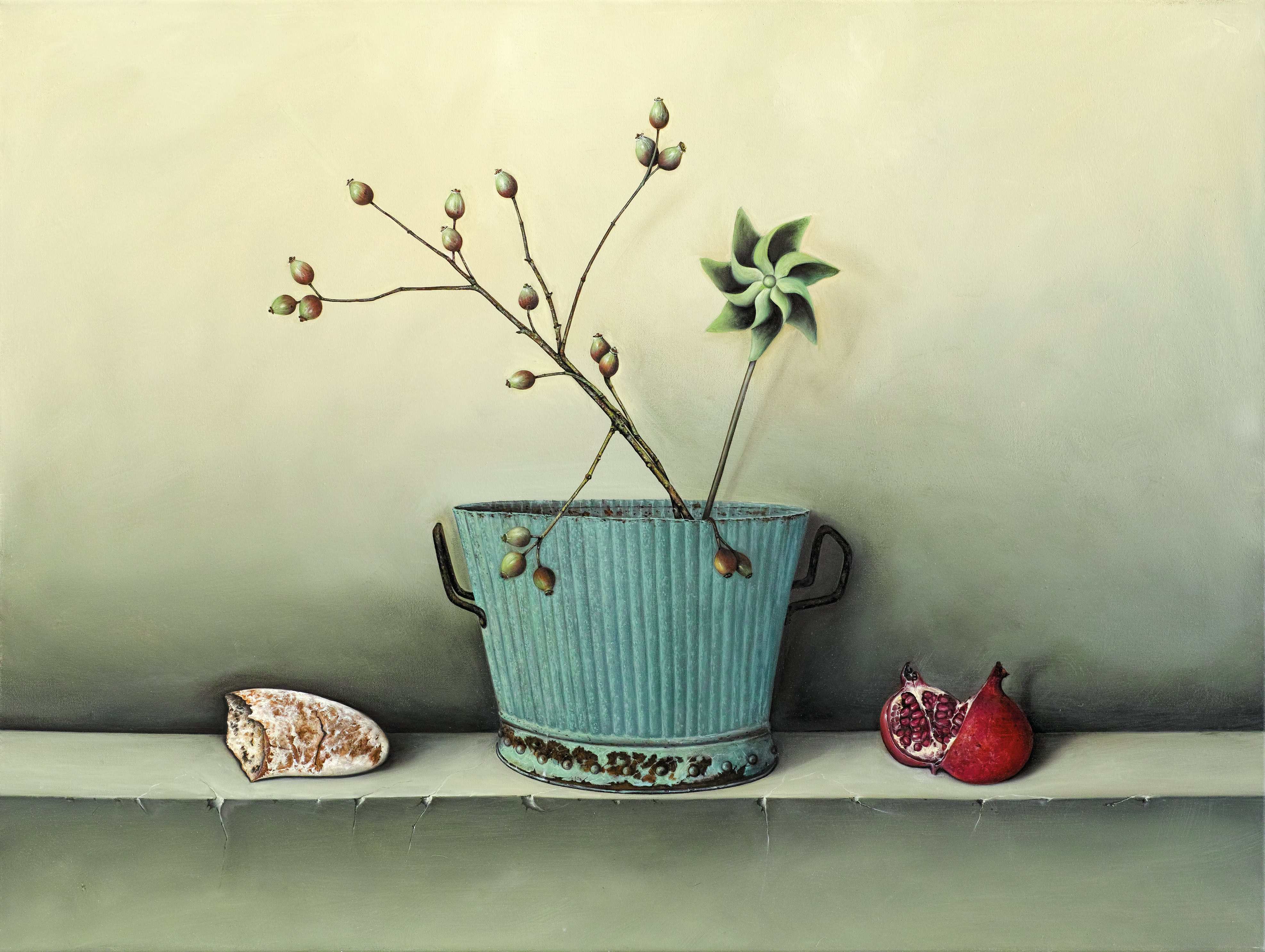 Zwischen Hyperrealismus in der Malweise und einem „surrealistischen Akzent“ der Komposition entstehen Szenen, in denen die ausgewählten Objekte ihren Platz einnehmen. Die Beleuchtung, ein sehr wichtiger Punkt in der Komposition, umfasst Hell-Dunkel-Objekte und das Licht individualisiert und isoliert sie.